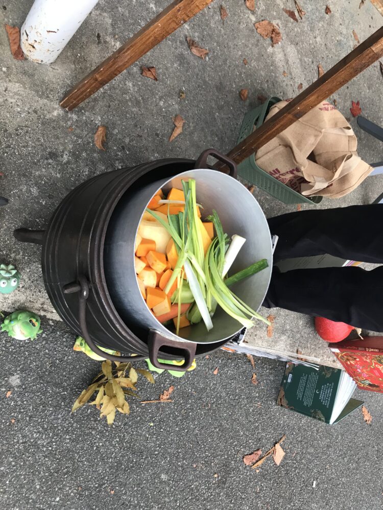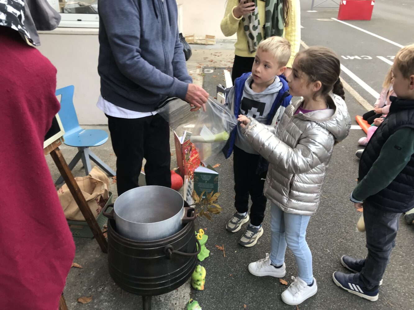 Ils ont appris à reconnaître les différents légumes puis , grâce à Lætitia de la bibliothèque , ils ont frissonné en écoutant des histoires de soupe et de sorcières.