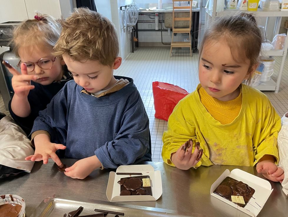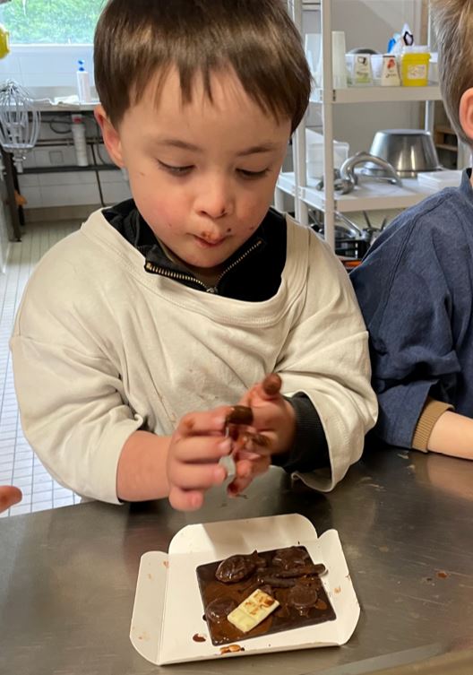Nous avons eu la chance de réaliser une atelier « Chocolat » à la boulangerie – chocolaterie Romélie, chez les parents d’Enzo !