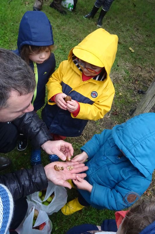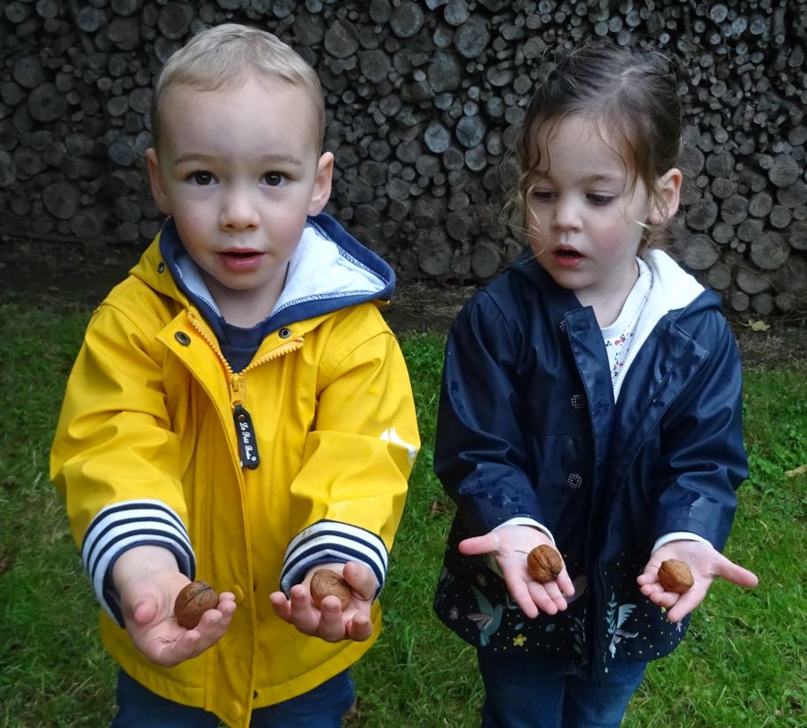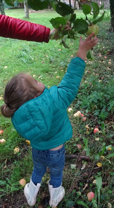 Lundi 26 septembre, la classe des PS-MS a rejoint le verger de Marie-Té et Jean-Guy en suivant le chemin qui longe l’école et pris le temps d’observer la nature et ramasser quelques trésors ! Sur place, nous avons découvert des rangées d’arbres et dans les branches ou au sol … des pommes ! Une fois les explications données sur les pommes à ne pas ramasser (trous, vers, tâches…), c’est parti pour la cueillette ! Bien sûr, nous en avons goûté quelques-unes directement dans le verger ! Les enfants ont aussi été ravis de découvrir les autres fruits du jardin : noix, raisin et un beau champignon !