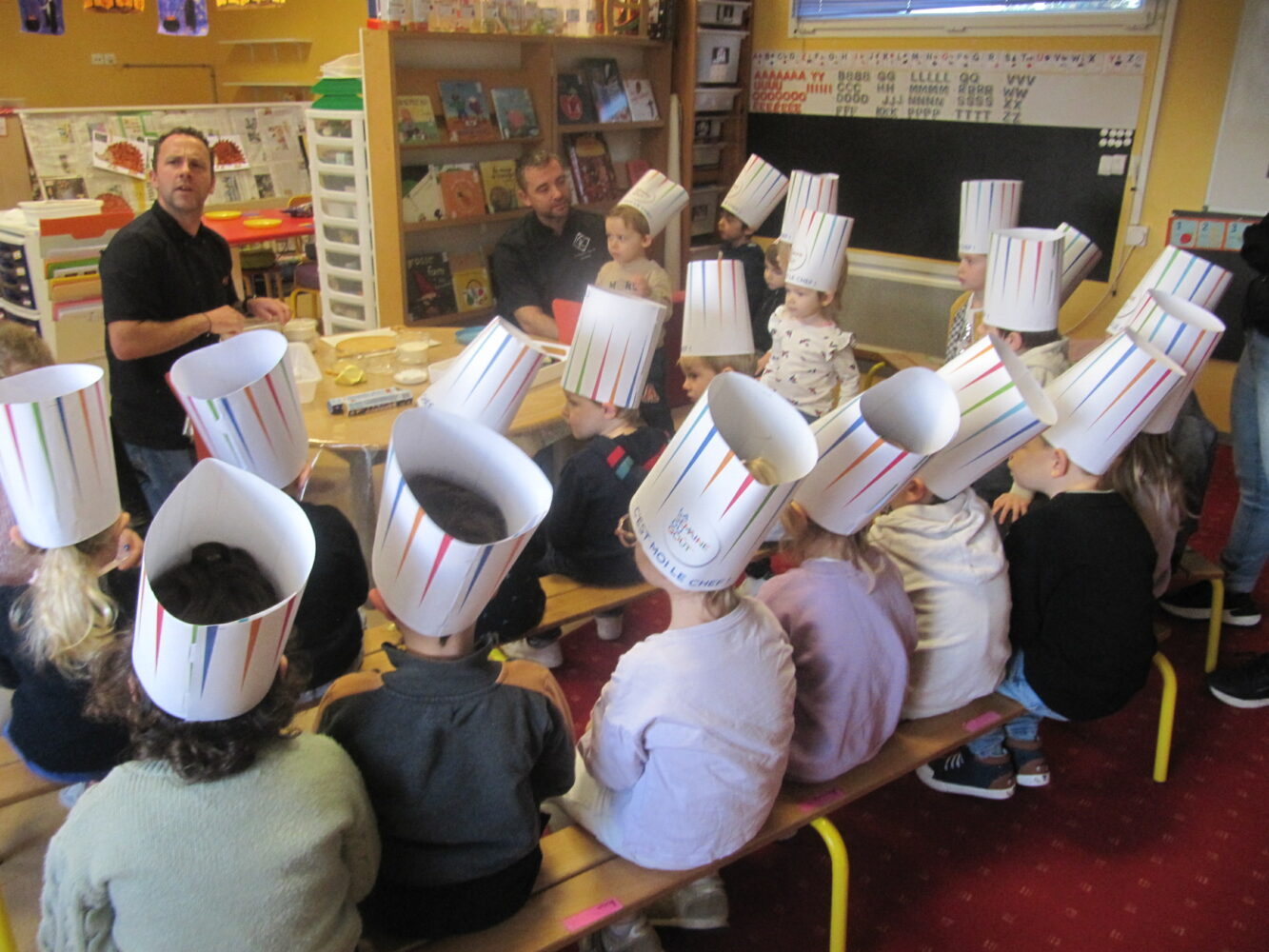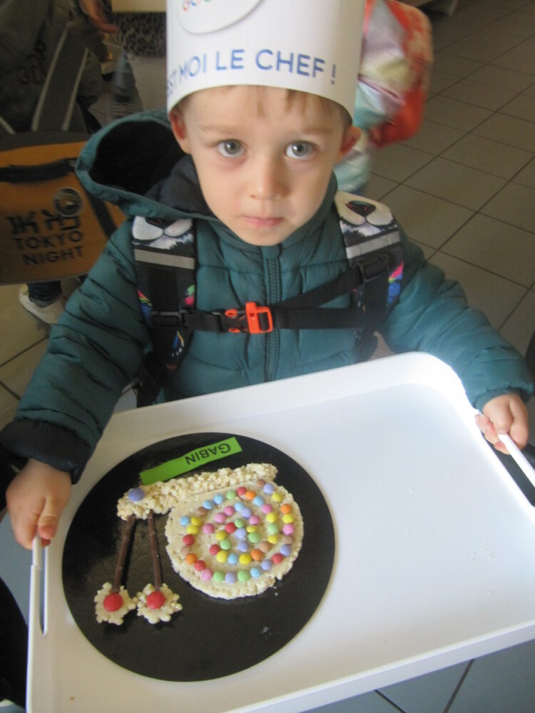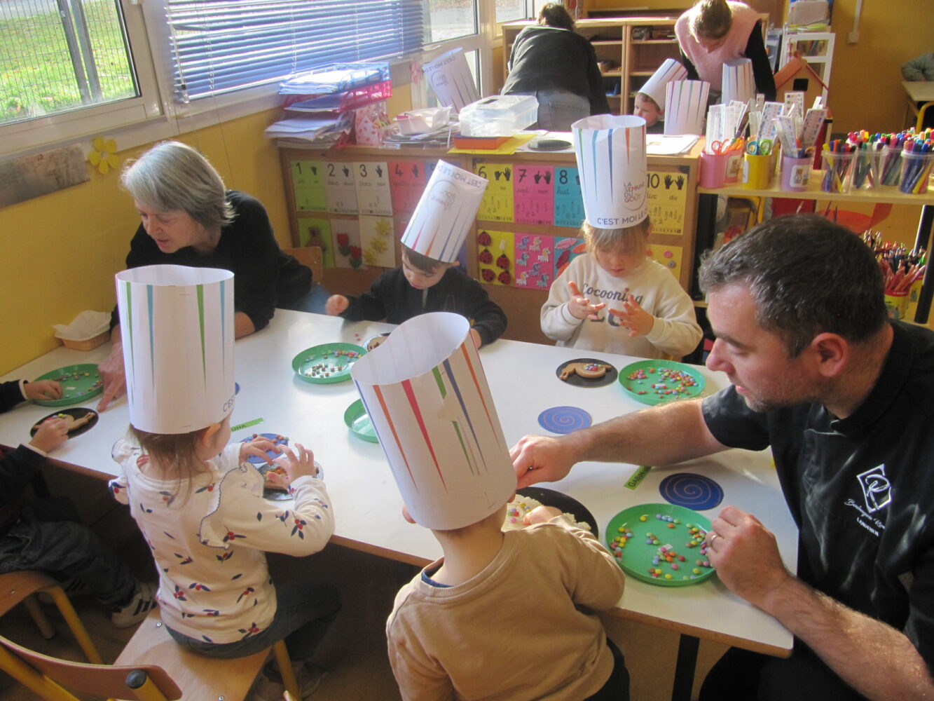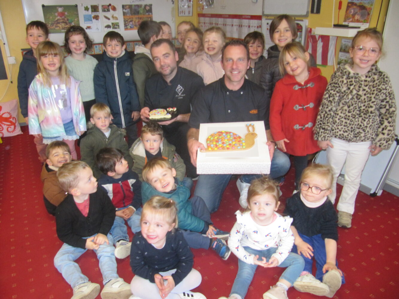 Dans le cadre de leur projet annuel intitulé “Une année à croquer”, les petites et grandes sections ont accueilli deux chefs pâtissiers Maxime et Romain pour un atelier sucré de saison : des petits escargots à croquer. Après avoir mélangé les ingrédients de la pâte sablée, Maxime a découpé des silhouettes escargots puis chaque enfant a décoré la spirale de sa coquille. Les petites sections devaient respecter la consigne “je change de couleur à chaque fois” et les grandes sections devaient réaliser un algorithme à 4 couleurs. Mission accomplie ! Bravo les pâtissiers en herbe et un grand merci à Maxime et Romain d’être venus nous partager leur savoir-faire !