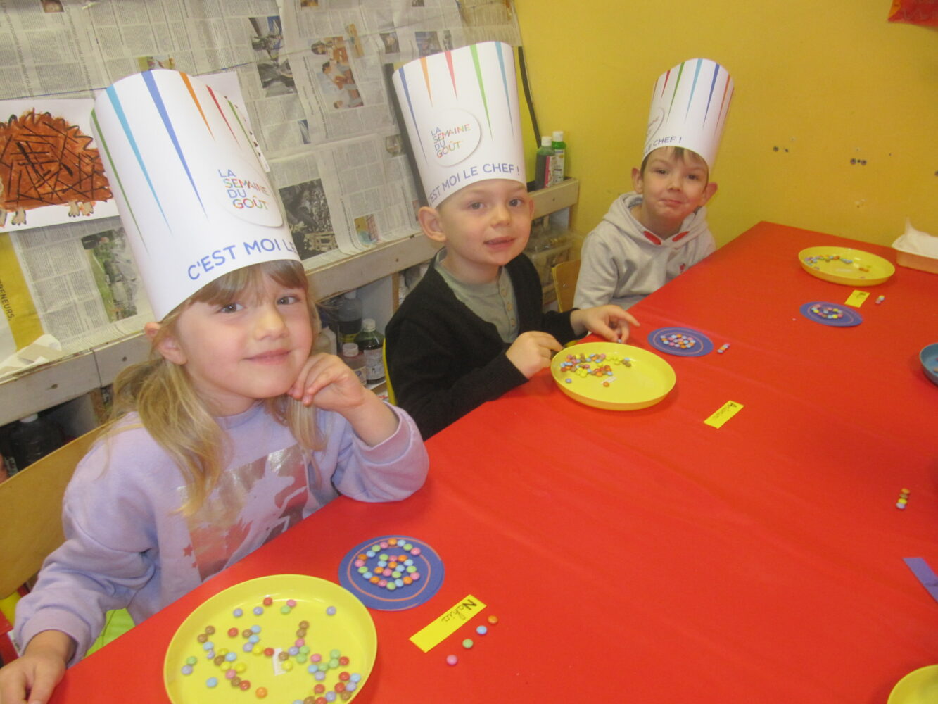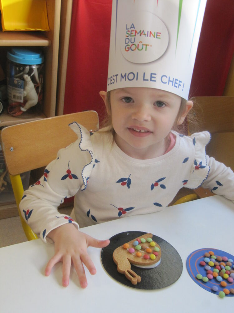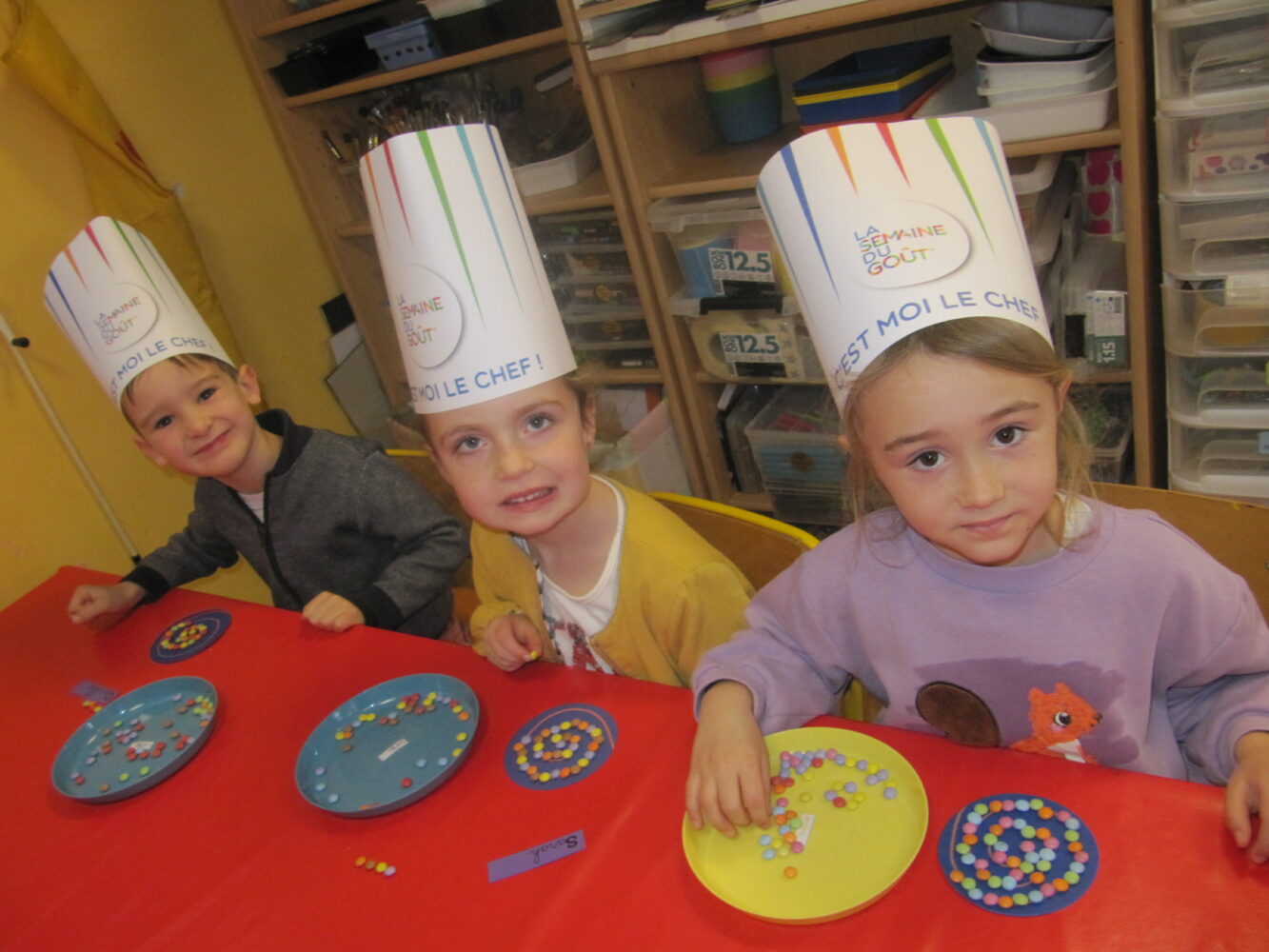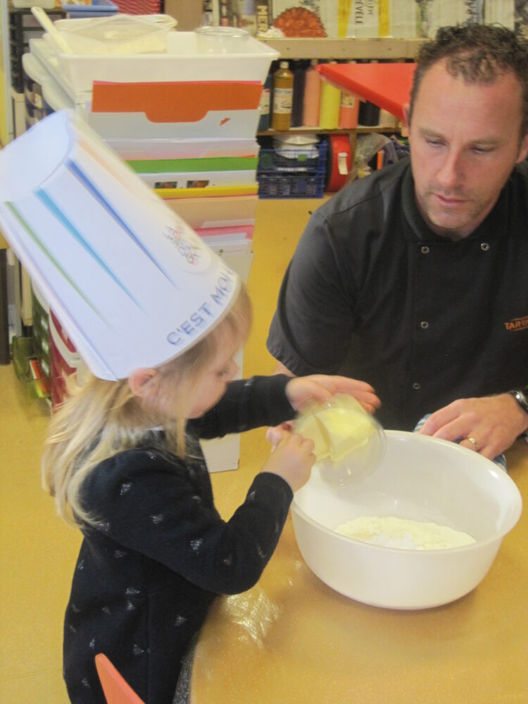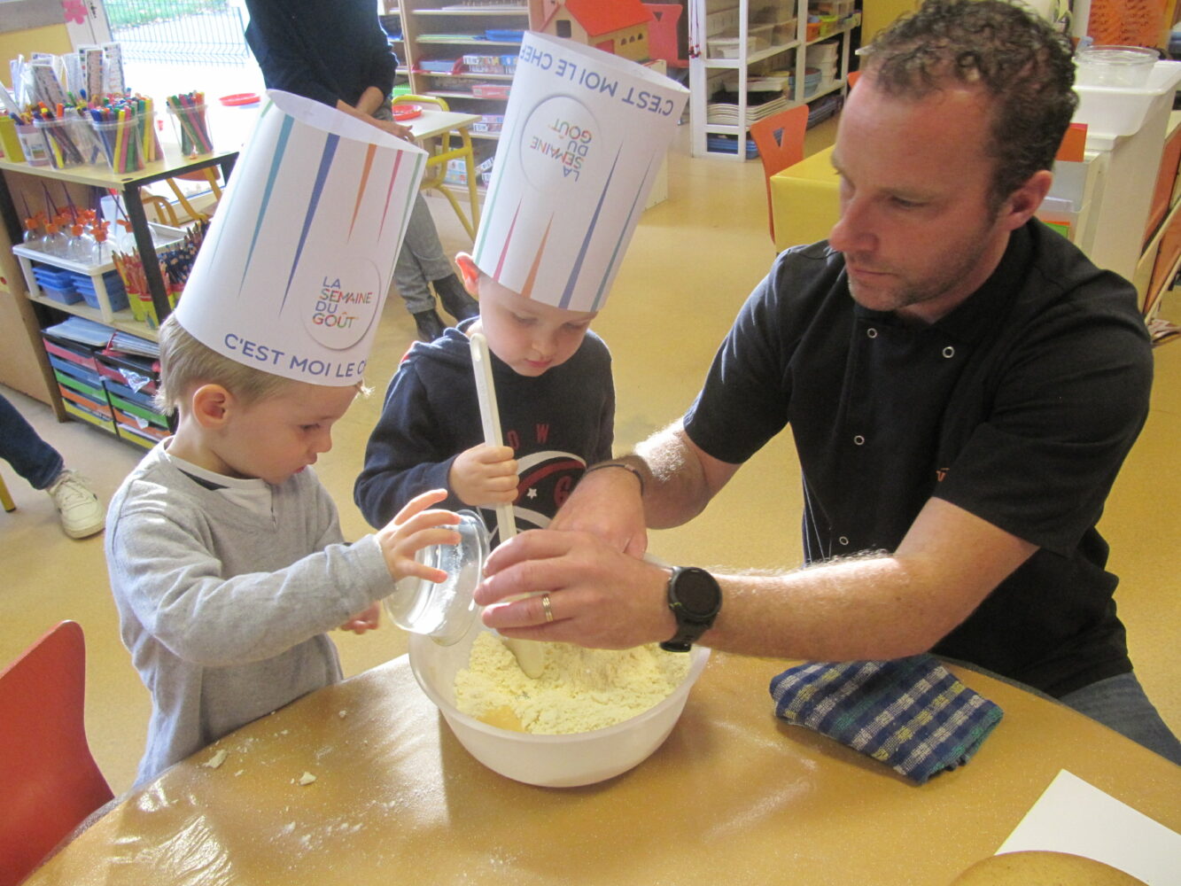 Dans le cadre de leur projet annuel intitulé “Une année à croquer”, les petites et grandes sections ont accueilli deux chefs pâtissiers Maxime et Romain pour un atelier sucré de saison : des petits escargots à croquer. Après avoir mélangé les ingrédients de la pâte sablée, Maxime a découpé des silhouettes escargots puis chaque enfant a décoré la spirale de sa coquille. Les petites sections devaient respecter la consigne “je change de couleur à chaque fois” et les grandes sections devaient réaliser un algorithme à 4 couleurs. Mission accomplie ! Bravo les pâtissiers en herbe et un grand merci à Maxime et Romain d’être venus nous partager leur savoir-faire !