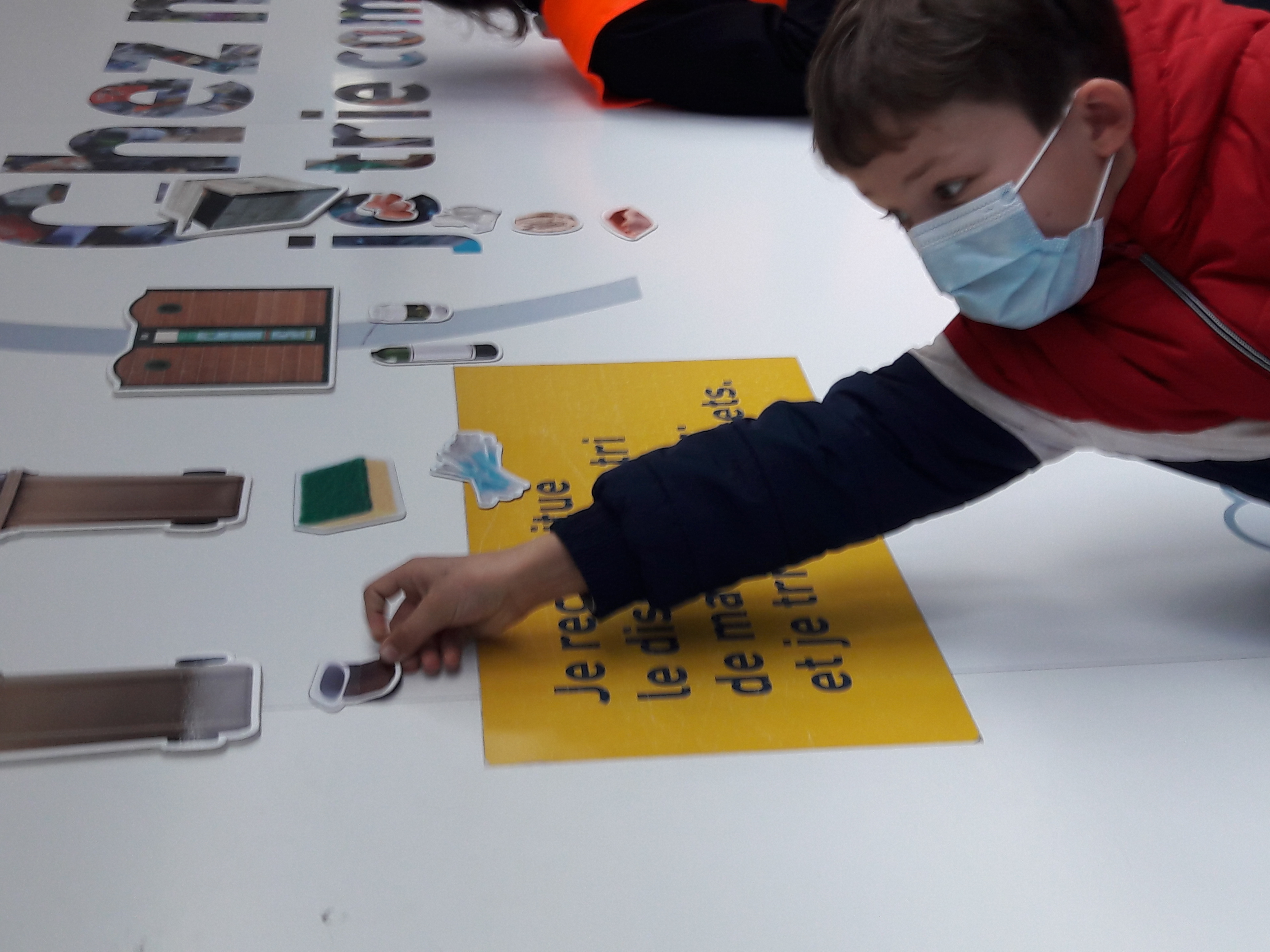 - Atelier “tri des déchets” : On nous a donné chacun une photo d’un déchet qu’il fallait mettre dans la bonne poubelle : la poubelle jaune (pour le recyclage), la poubelle noire (les déchets ménagers), la poubelle des verre, le composteur ou la déchetterie. (ce2/cm1).