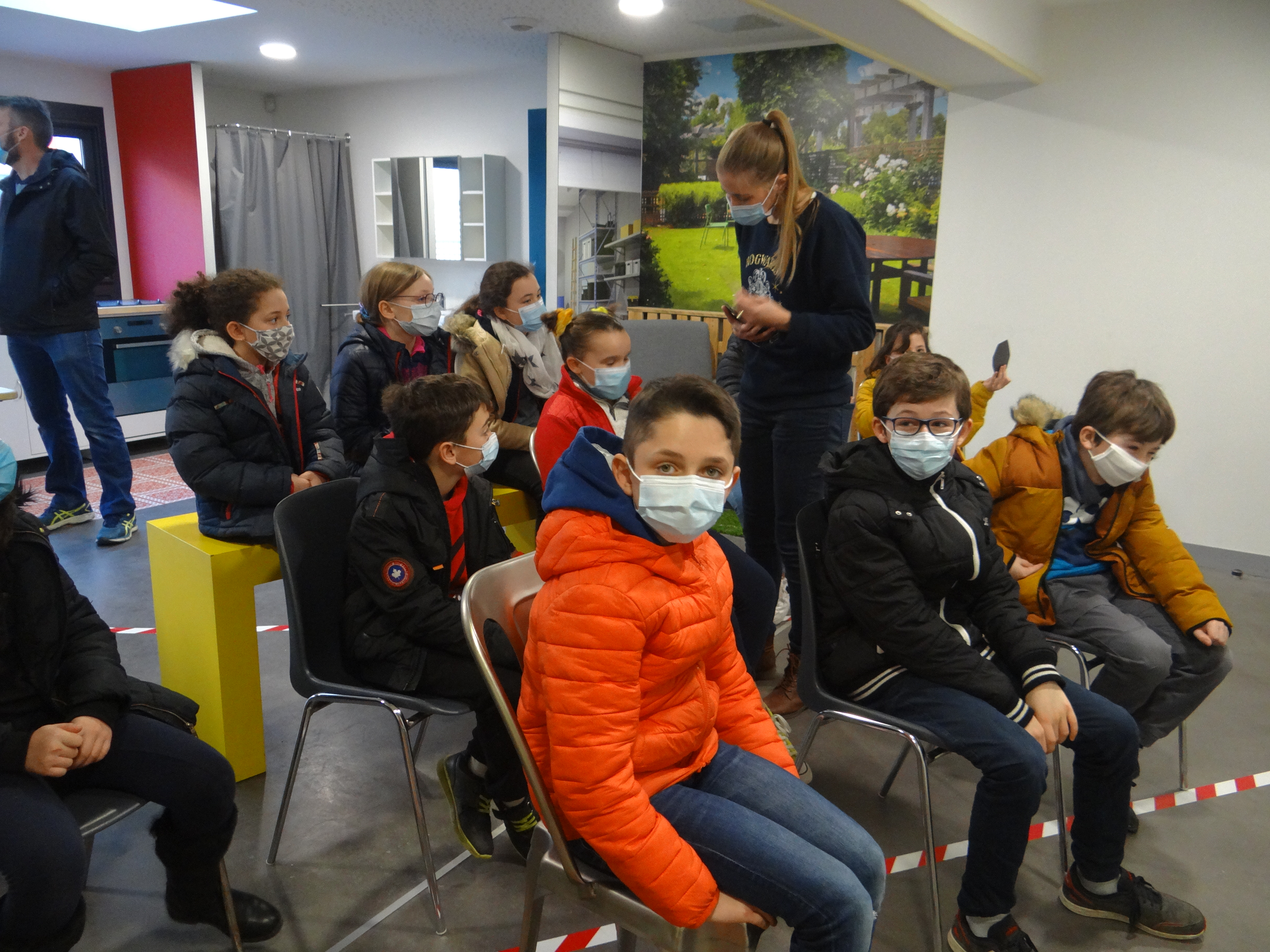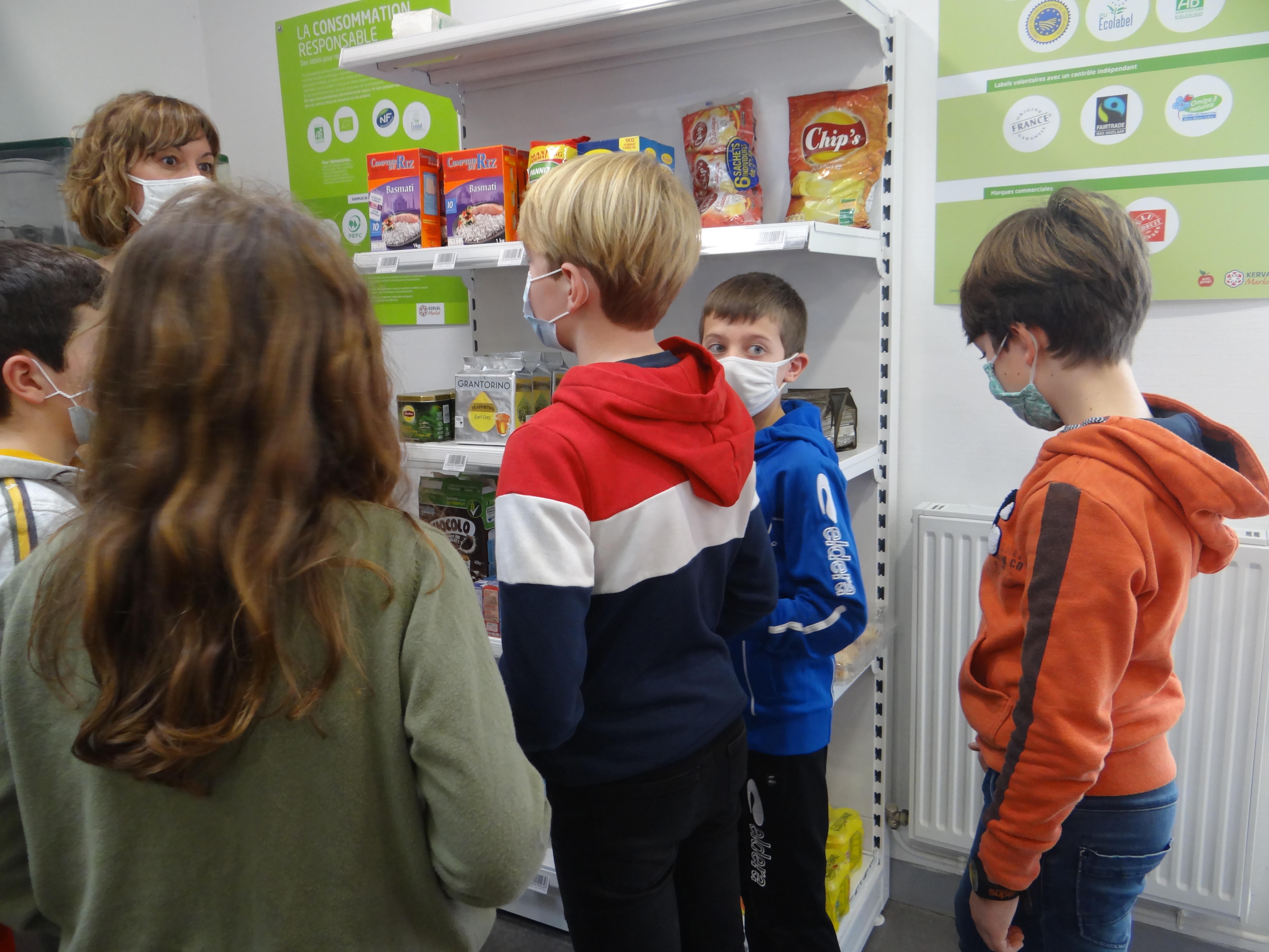 - Atelier “achat” : Par équipes de trois, nous devions acheter une liste d’aliments avec le moins d’emballage possible. Il fallait choisir des fruits locaux et de saison. Ensuite, on scannait les aliments avec le code barre, et notre score s’affichait. L’équipe gagnante était celle qui avait le moins de points. (les CE2/CM1)